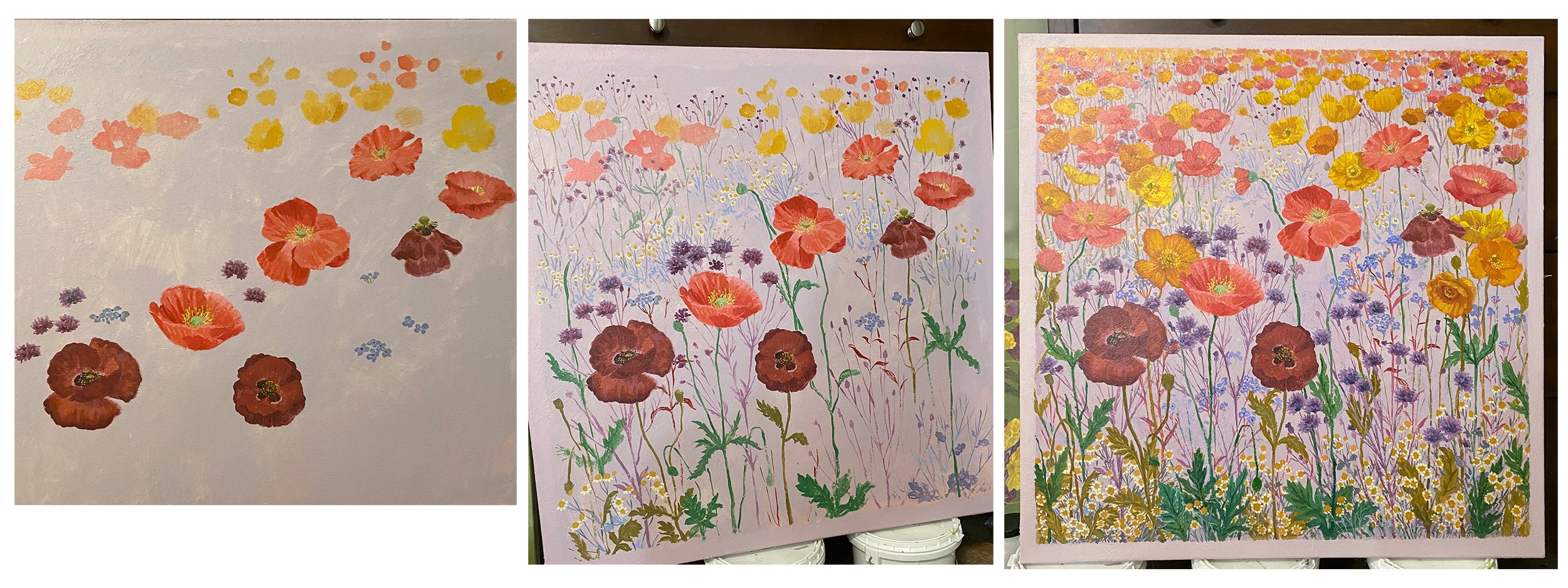 And finally, this poppy painting was the last painting that I started during maternity leave. I really struggled with how many flowers to paint in this one — I love the simplicity when there were only a few flowers, but also, can there ever be too many poppies??