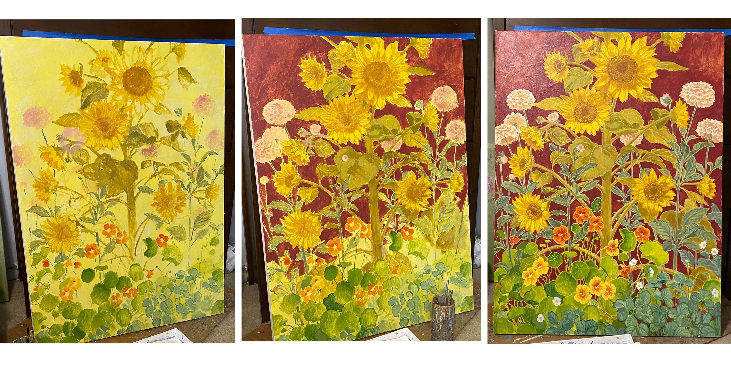 Another work in process. I feel like the “Mother” sunflower is protecting the other plants.